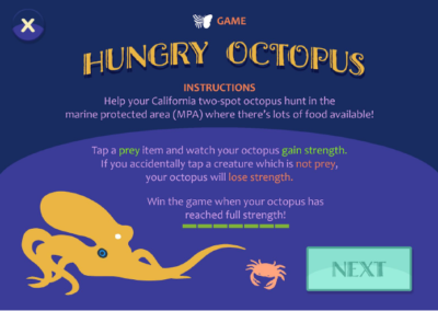 The Monterey and San Luis Obispo Collaborative project team is finalizing exciting updates to the previously created bilingual MPA Coloring Book and California Coastal Explorer Guide. The updated booklets will include QuiverVision 3D augmented reality coloring pages that link to interactive and educational experiences featuring a California two-spot octopus and lingcod. Learners will help these species likely to benefit from MPAs find food and grow strong in their protected habitats. Completed booklets are expected to be printed and shipped to Collaboratives for distribution in the spring of 2021.